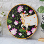 This beautiful pichwai painting features a serene white cow adorned with a vibrant floral headdress.